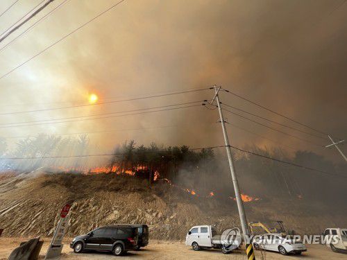 (울진=연합뉴스) 김선형 기자 = 경북 울진군에 산불이 확산하며 36번 국도 일부 구간 교통이 통제됐다.