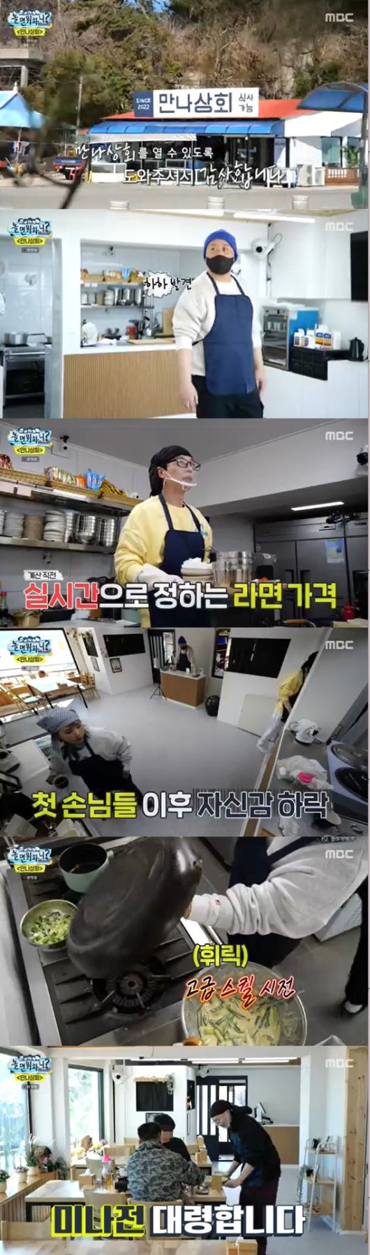 5일 오후 방송된 MBC ‘놀면 뭐하니?'에서 유재석, 정준하, 하하, 신봉선은 강원도 양양의 한 식당에 모였다. 이들은 식사를 하러 온 줄 알았지만, 제작진은 이들에게 만나상회의 1일 주인이 돼 식당을 운영하라는 미션을 던졌다. 이에 멤버들은 반발했으나, 곧 바쁘게 영업 준비를 하게 됐다. 이들 중 신봉선이 가장 빠르게 적응하며 에이스로 떠올랐다.
