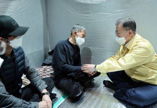 청와대는 문 대통령이 이날 오전 울진국민체육센터에 마련된 이재민대피소를 찾아 이재민들을 위로했다고 밝혔다. 이재민대피소에는 산불로 긴급히 대피한 마을 주민 500여명이 지내는 것으로 알려졌다.