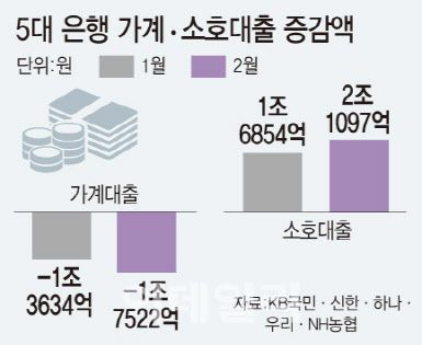 이는 가계대출 증가세가 꺾인 것과 상반된 모습이다. 지난달 5대 은행 가계대출은 705조9373억원으로 전월보다 1조7522억원 감소했다. 앞서 1월에도 1조3634억원 줄어 2개월 연속 감소세를 나타냈다. 올해 가계대출 감소폭은 3조1156억원이다.