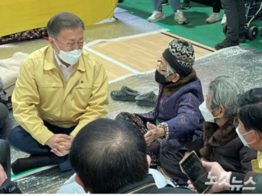 문재인 대통령이 6일 울진 국민체육센터에 마련된 이재민 대피소를 찾아 이재민을 위로하고 있다. 독자 제공"노약자분들 집이 무너진 것을 보면 너무 큰 상처를 받을 것 같아, 마음이 안정되면 모시고 오려고 하고 있습니다" (울진 신화2리 이장)
