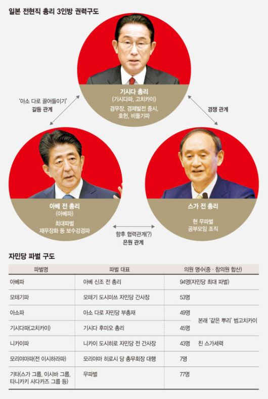 니카이파의 관계자는 최근 한 일본 언론에 "그가 니카이파, 아베파와 함께 '반기시다' 포위망을 결성하는 것도 생각해 볼 수 있다"고 언급했다. 아베 전 총리가 그런 스가 전 총리의 움직임을 눈여겨 보고 있다고 한다. 스가파와 연합해, 반(反)기시다 진영을 구축하겠다는 것이다. 맹우 아소 부총재가 지는 해이라면, 스가 전 총리는 뜨는 해라는 것이다.