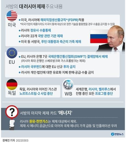 여기에 핵심 부품이나 기술의 이전을 차단하는 수출규제를 추가했으며, 푸틴 대통령 본인과 측근을 직접 겨냥한 제재도 발동했다.