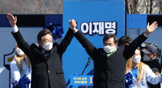 더불어민주당 이재명 대선 후보가 6일 오후 서울 도봉구 도봉산 입구에서 열린 유세에서 새로운물결 김동연 대표와 손을 잡고 인사하고 있다. (사진= 국회사진기자단) |