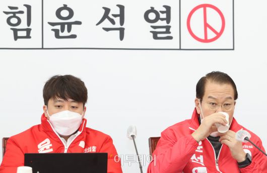 이준석 국민의힘 대표와 권영세 선거대책본부장이 7일 오전 국회에서 열린 확대선거대책본부 회의에 참석해 있다. |