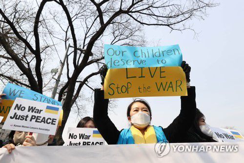 한국여성변호사회(여변)는 7일 오후 서울 중구 주한 러시아대사관 인근에서 집회를 열고 러시아의 우크라이나 침공이 "인류 보편적 가치에 반하는 반인류적 행위"라며 "즉시 전쟁을 중단하라"고 요구했다.