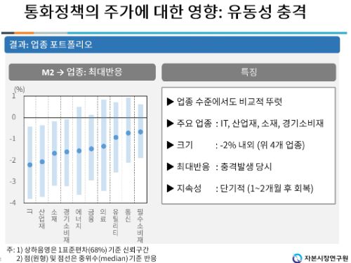 장 연구위원은 "M2(통화량) 감소 충격 발생 시 코스피 지수가 하락하는 한편, 업종 포트폴리오 중에서는 IT, 산업재, 소재 및 경기소비재 주가가 하락했다"며 "주요 금융·경제 지표 중 경기와의 상관성이 높은 업종일수록 통화정책에 민감하게 반응했다"고 설명했다.