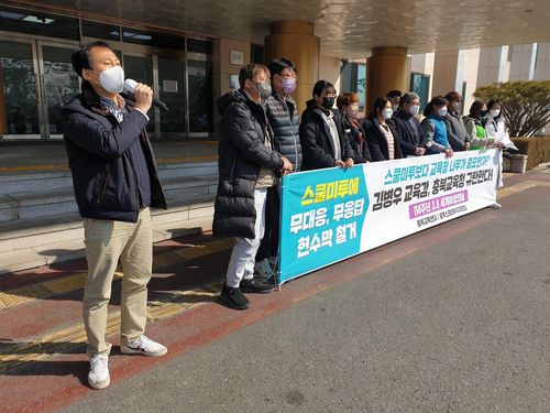 이들은 "(시민단체가) 스쿨미투 대책을 요구하기 위해 도교육청 정문 앞에서 설치해 놓은 현수막을 도교육청이 지난달 철거했고, 원상복구 요구에 대한 답도 없었다"고 주장했다.