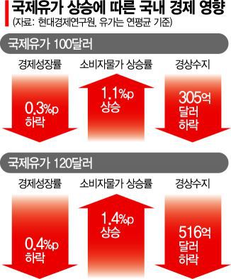 현대경제연구원은 국제유가가 100달러이면 경제성장률은 0.3%포인트, 소비자물가는 1.1%포인트, 경상수지는 305억달러 하락할 것으로 추산했다. 유가가 120달러까지 치솟으면 각각 0.4%포인트, 1.4%포인트, 516억달러 내릴 것으로 봤다.