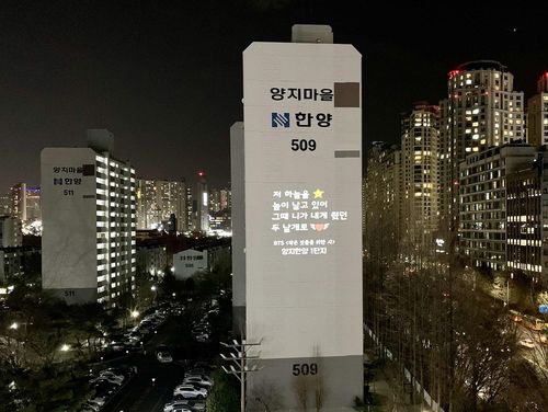 (성남=연합뉴스) 이우성 기자 = 유재석·이적의 '말하는 대로', BTS의 '작은 것들을 위한 시', 이한철의 '슈퍼스타' 등 아름다운 노래 가사가 야간시간대 아파트 외벽을 장식해 눈길을 끌고 있다.