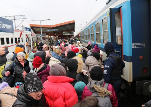(프셰미실·코르쵸바[폴란드]=연합뉴스) 전성훈 특파원 = 7일(현지시간) 폴란드 국경도시 프셰미실 중앙역 4번 플랫폼. 폴란드 수도 바르샤바행 열차가 들어오자 우크라이나 난민이 한꺼번에 열차 출입문으로 몰리면서 아수라장이 됐다.