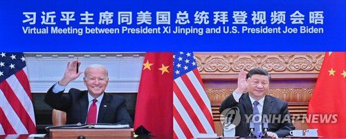화상 회담서 손 흔들며 인사하는 미중 정상 |