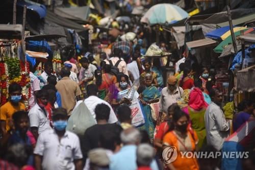 코로나19 확산세가 주춤해지면서 인파로 혼잡한 인도 첸나이의 한 시장. |