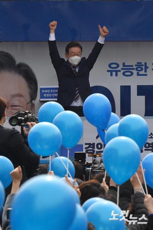 이재명 더불어민주당 대선 후보가 8일 경기도 파주시 야당역 1번 출구 앞에서 지지를 호소하고 있다.