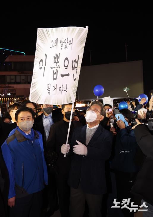 더불어민주당 이재명 대선후보가 8일 서울시 마포구 홍대 걷고싶은거리 광장무대에서 열린 마지막 유세에서 자신을 응원하는 글귀를 보며 웃고 있다.※CBS노컷뉴스는 여러분의 제보로 함께 세상을 바꿉니다. 각종 비리와 부당대우, 사건사고와 미담 등 모든 얘깃거리를 알려주세요.이메일 : nocutnews@cbs.co.kr카카오톡 : @노컷뉴스저작권자 © CBS 노컷뉴스 무단전재 및 재배포 금지
