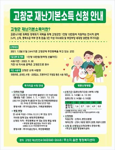 지원 대상자는 2021년 12월 31일 기준 고창군에 주민등록을 둔 군민으로, 오는 14일부터 다음 달 13일까지 읍면 사무소에서 신청하면 된다.