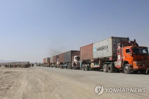 아프간으로 이동하기 위해 파키스탄 국경서 대기 중인 트럭. |