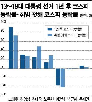 선거 1년 이후 코스피 상승률이 가장 높았던 노태우 대통령은 3저 호황(저유가·저금리·저달러) 후반부에 정권을 잡았고, 하락률이 가장 큰 이명박 대통령은 글로벌 금융위기 여파가 본격화된 시점에 임기를 시작했다. 변준호 흥국증권 연구원은 "과거 대통령 취임 후 증시가 상승했던 사례도 새로운 정책에 대한 기대감이 반영됐다기보다 세계 경기 호조 내지는 우호적 증시 환경 등의 영향이 컸다"고 분석했다.