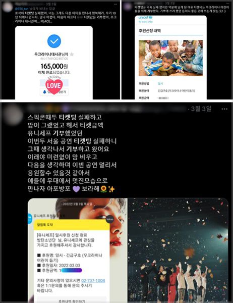 수많은 팬들이 "방탄소년단 못 만나도 뿌듯하다. 좋은 곳에 쓰였으면 좋겠다"며 우크라이나 대사관은 물론 유니세프, 세이브더칠드런, 월드비전 등에 티켓 값을 기부하고 인증 글을 남겼습니다. 이에 다른 아미들도 "아미는 티켓팅 실패하면 기부를 한다고 배웠다"면서 "콘서트 못 간 팬분들의 기부에 저도 동참한다"고 뜻깊은 기부 행렬에 힘을 보탰습니다.