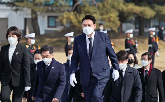 윤석열 제20대 대통령 당선인이 첫 외부 공식일정으로 10일 서울 동작구 국립 현충원을 찾아 참배하기 위해 걸어가고 있다. 왼쪽은 김기현 국민의힘 원내대표, 오른쪽은 이준석 당대표. [이승환 기자] |