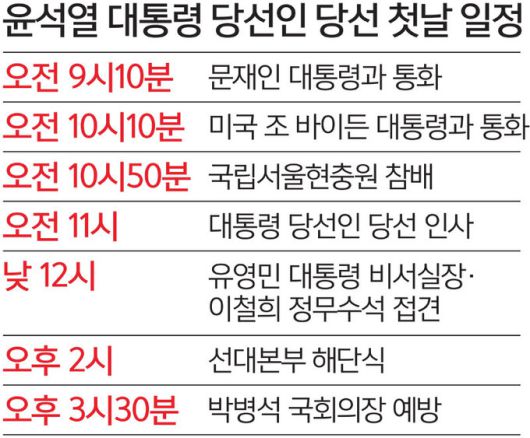 윤석열 대통령 당선인은 당선 첫날인 10일 문재인 대통령과 조 바이든 미국 대통령과 잇단 통화를 시작으로 숨 가쁜 공식 일정을 소화했다. 윤 당선인은 곧장 유영민 대통령 비서실장을 만나 인수위원회 구성을 위한 협력을 당부했고, 문 대통령을 조속한 시일 내에 만나겠다고 밝혔다.
