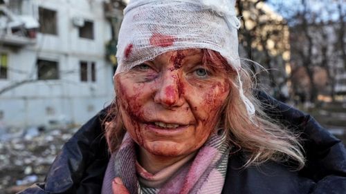 이 사진은 러시아의 우크라이나 침공이 얼마나 비인도적이고 잔인한 것인지를 보여주는 것으로 각국 신문 표지를 장식했다. 다만 러시아는 사진 속 여성이 우크라이나군 관계자라고 소개하며 얼굴의 피도 포도 주스처럼 보인다는 황당한 주장을 제시했다. 이 뉴스는 텔레그램 채널에도 소개됐는데 러시아인 60만명 이상이 이 글을 읽었다고 뉴욕타임스는 전했다.