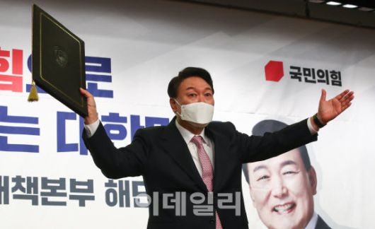 윤석열 대통령 당선인이 10일 오후 서울 여의도 국회 도서관에서 열린 ‘국민의힘 선거대책위원회 해단식’에 참석해 당선증을 받고 있다. (사진=이영훈 기자) |
