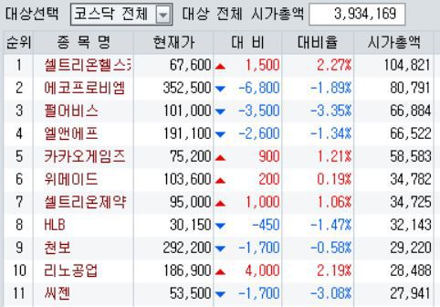 시가총액 상위 종목을 보면 씨젠이 3.08%하락하며 시총 11위로 밀려났다. 리노공업은 2.24% 상승하며 10위로 올라섰다. 시총 1위인 셀트리온헬스케어는 상승폭을 줄이며 2.27% 오름세를 보이고 있다. 카카오게임즈, 위메이드, 셀트리온 제약은 각각 1.21%, 0.19%, 1.06% 상승중이다. 반면 에코프로비엠(-1.89%), 펄어비스(-3.35%), 엘앤에프(-1.34%), HLB(-1.47%), 천보(-0.58%) 등은 하락 중이다.