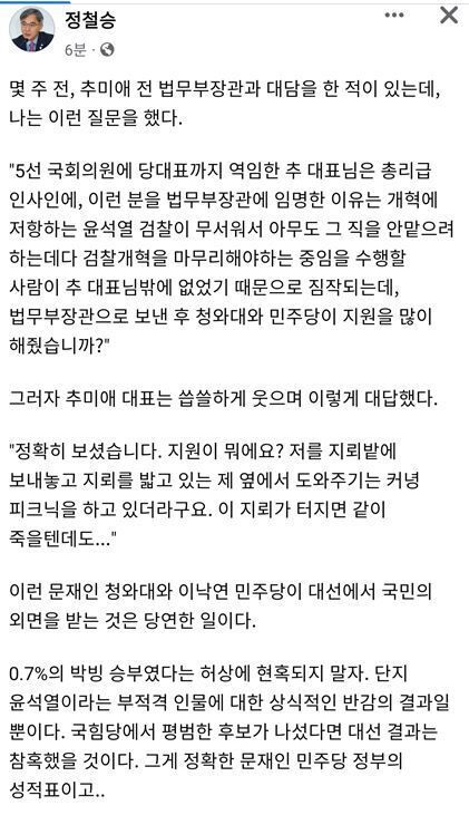 이 같은 대담을 전한 정 변호사는 "0.7%의 박빙 승부였다는 허상에 현혹되지 말자. 단지 윤석열이라는 부적격 인물에 대한 상식적인 반감의 결과뿐"이라며 "국힘당에서 평범한 후보가 나섰다면 대선 결과는 참혹했을 것이다. 그게 정확한 문재인 민주당 정부의 성적표이고..."라고 비판했다.