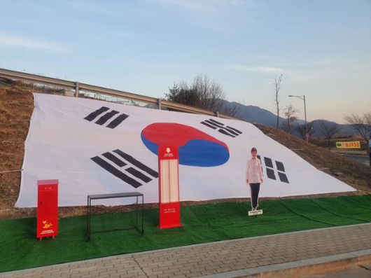 사저 앞 대형 태극기 앞에 응원엽서함 등장