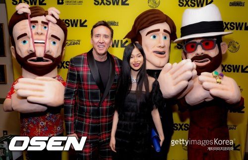 케이지가 아내 시바타 리코(27)와 함께 12일(현지시간) 미국 텍사스 주 오스틴의 파라마운트 극장에서 열린 2022 SXSW 컨퍼런스의 영화 '엄청난 재능의 견딜 수 없는 무게'(The Unjustable Weight Of Massive Tale)' 시사회에 참석했다.