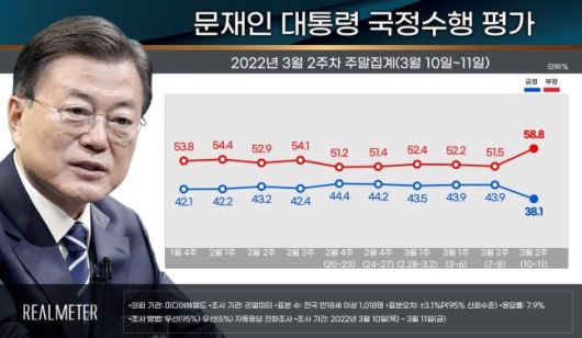 오늘(14일) 발표된 리얼미터가 미디어헤럴드 의뢰로 지난 10일~11일 이틀간 실시한 3월 2주차 주말 조사 결과에 따르면 문 대통령 국정수행 지지도는 직전 조사 대비 5.3%p 낮아진 38.1%(매우 잘함 22.7%, 잘하는 편 15.3%)로 집계됐습니다.