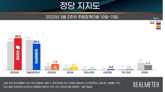 정당 지지도는 ▲ 국민의힘 43.2% ▲ 더불어민주당 35.6% ▲ 국민의당 7.8% ▲ 정의당 3.9% ▲ 기본소득당 1.1% ▲ 시대전환 0.8% ▲ 기타정당 1.3%로 나타났습니다.
