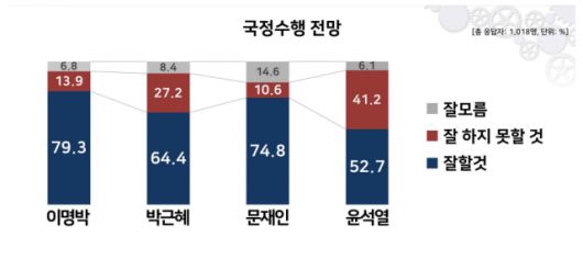 리얼미터가 과거 역대 대통령 당선 직후 조사했던 국정 수행 전망을 보면 '잘할 것'이라는 답변은 이명박 전 대통령 79.3%, 박근혜 전 대통령 64.4%, 문재인 대통령 74.8% 등을 기록했었습니다.