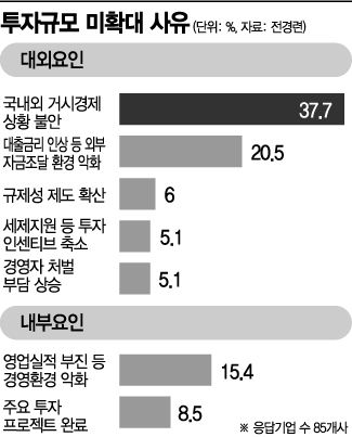 전경련에 따르면 투자규모 미확대 사유 중 대부분(74.4%)이 기업 내부사정보다는 대외환경 취약에서 비롯됐다고 분석했다. 전경련은 "거시경제 불안정, 규제 강화 등 대외환경이 취약한 것이 투자규모 축소 등으로 이어지고 있다"고 설명했다.