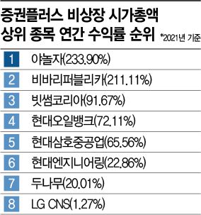 수익률도 선학개미를 이끄는 원동력이다. 시가총액 상위 종목 중에서 지난해 연간 수익률 순위는 야놀자(233.90%), 비바리퍼블리카(211.11%), 빗썸코리아(91.67%), 현대오일뱅크(72.11%), 현대삼호중공업(65.56%), 현대엔지니어링(22.86%), 두나무(20.01%), LG CNS(1.27%), 현대캐피탈(0.00%), 현대트랜시스(-1.69%) 등으로 나타났다.