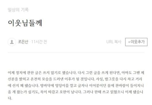 14일 조은산의 블로그에 따르면, 그는 이날 새벽 "사실 밥그릇을 다시 차고 거리에 선 지 꽤 됐다"며 "방바닥에 엉덩이를 깔고 글자나 이어 붙이던 몸에 찬바람이 들이치니 올 게 왔는가 싶기도, 목이 따갑고 오한이 난다. 그러나 한때 쓰고 읽혔으니 이제 됐다"며 이같이 밝혔다.