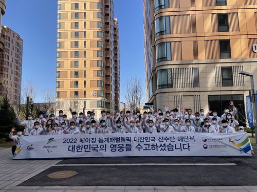 (베이징=연합뉴스) 장보인 기자 = 2022 베이징 동계패럴림픽에 출전한 대한민국 선수단이 14일 오전 중국 베이징 선수촌 내 슈퍼 레지던스 센터 앞에서 해단식을 열었다.