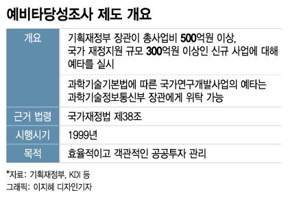 예타는 대규모 정부 예산이 투입되는 사업에 대해 사업의 경제성을 사전에 검증하는 제도다. 국가재정법에 따라 총 사업비가 500억원 이상이거나 국가 재정 지원이 300억원 이상인 신규 사업을 대상으로 한다.