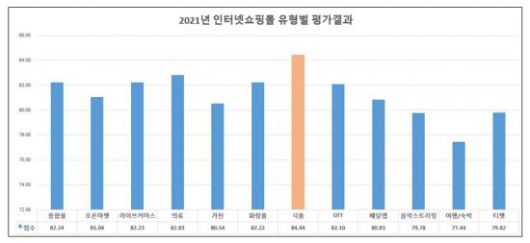 평가결과 업종별로는 ‘식품몰’이 평균 84.44점으로 가장 높았고, ‘의류몰(평균 82.83점)’, ‘종합몰(평균 82.24점)’이 뒤를 이었다. 반면 ‘OTA(평균 77.44점)’가 낮은 점수를 받아 지속적인 관리가 필요한 것으로 조사됐다. 2020년에 이어 ‘식품몰’이 소비자들의 높은 점수를 받은 것은 1인 가구 증가와 코로나19가 지속된 가운데 밀키트 등에 대한 온라인 수요 증가에 대응하여 소비자들의 편의를 높였기 때문으로 분석된다.