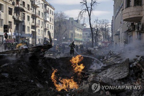러군 로켓공격 뒤 화재 진압 나선 우크라 소방관들 |