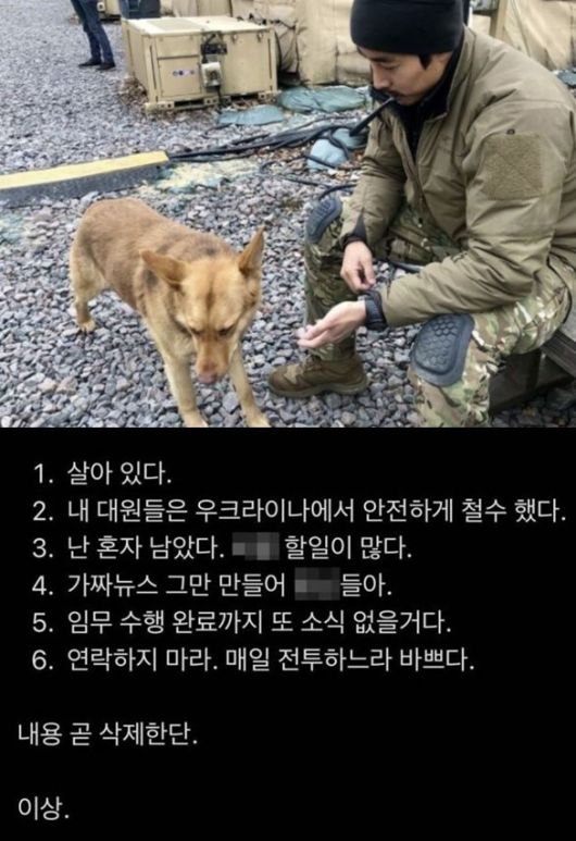 이근은 “살아 있다. 내 대원들은 우크라이나에서 안전하게 철수했다”며 “난 혼자 남았다. 씨X 할 일이 많다. 가짜뉴스 그만 만들어 XX들아. 임무 수행 완료까지 또 소식 없을 거다. 연락하지 마라. 매일 전투하느라 바쁘다”라고 알렸다.