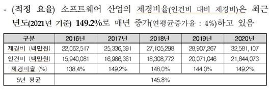 근거로 한국은행 경제통계시스템의 SW산업 제경비 분석 결과 다른 산업과 제경비 격차를 제시했다. 한국은행 통계 기준을 적용한 SW산업 제경비율은 2021년 기준 149.2%, 최근 5년 평균은 145.8%다. 매년 평균 4% 증가하고 있음을 확인했다. 기존 110~120%와는 차이가 크다는 것이다. 기존 제경비율 산정 때 준용한 엔지니어링 산업에 같은 산출 방식을 적용한 결과 SW산업 제경비율이 엔지니어링 산업 대비 50%P 이상 높게 나타났다.