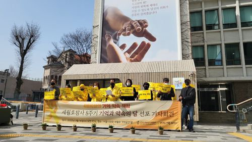 (서울=연합뉴스) 김치연 기자 = 세월호 참사 8주기를 앞두고 피해자 가족 단체 등이 문재인 대통령과 새롭게 취임할 윤석열 당선인에게 세월호 참사와 관련해 공식적 사과와 진상규명, 책임자 처벌 완수 등을 촉구했다.