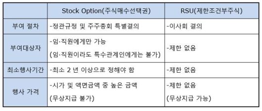 스톡옵션은 우리나라 상법에서 주식매수선택권이라는 용어로 규정되고 있습니다. 스톡옵션과 비교하여 RSU의 두드러지는 장점은 ▲절차가 간이하고 ▲부여대상자에 제한이 없으며 ▲최소행사기간이 없고 ▲무상제공이 가능하다는 것입니다. 이를 표로 정리해보겠습니다.