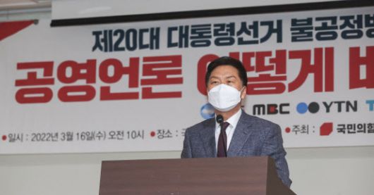 김기현 국민의힘 원내대표가 16일 서울 여의도 국회의원회관에서 열린 ‘제20대 대선 불공정방송 100일간의 기록, 공영언론 어떻게 바뀌어야 하나’ 토론회에서 국민의례를 하고 있다.(사진=국회사진취재단) |