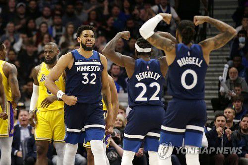 LA 레이커스를 20점 차로 꺾고 기뻐하는 미네소타 타운스, 베벌리, 러셀(왼쪽부터) |