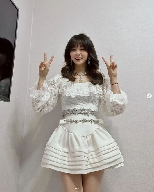 사진에서 김민아는 화이트 컬러의 드레스를 입었다. 레이스 장식이 돋보이는 화이트 드레스로 청순한 분위기를 자아냈다.