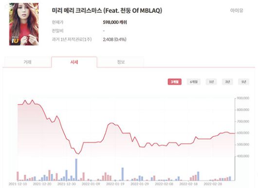 음원 저작권 투자 플랫폼 ‘뮤직카우’ 화면. 거래량, 투자 시세 차트 같은 투자 정보도 확인 가능하다. (뮤직카우 캡처) |