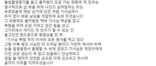 B씨의 친구는 인터넷 커뮤니티에 "살려달라는 친구의 외침에 상가에 있던 쿠팡 기사분이 주저 없이 남자를 제압해 도와주셨다"며 "연락처를 물어도 당연히 할 일을 했다며 가버리셨으나 감사 인사를 꼭 전하고 싶다"는 글을 올렸다.
